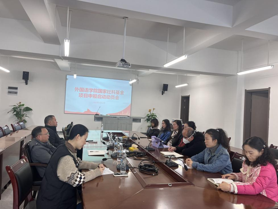 为深入贯彻落实学校科研工作部署,提前谋划并全力做好2026年度国家社科基金项目申报工作,外国语学院于2025年11月13日在学院会议室513隆重召开了2026年度国家社科基金项目申报动员会。外国语学院书记、院长付启宏,副院长冉海勇,各系主任、博士教师、科研骨干教师及部分青年教师代表参加了会议,冉海勇主持会议。付启宏首先强调了国家社科基金项目申报对于学院发展的重要性。他指出,国家社科基金项目是衡量学院科研实力和学...